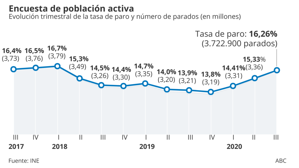 “Muchas de las razones por las que España se ha visto tan afectada probablemente también desembocarán en una lenta recuperación en 2021 y más allá. Es poco probable que el sector turístico se recupere por completo en 2021. Y la alta proporción de pequeñas empresas los servicios conducirá a un fuerte aumento de las quiebras y despidos. De hecho, un trabajo reciente del BCE muestra que uno de cada siete (14%) trabajadores españoles está en empresas en riesgo de quiebra, que la mayor proporción en la Eurozona. En comparación con los niveles anteriores a la crisis, la tasa de desempleo ya aumentó en 2,5 puntos porcentuales hasta el 16,3% en el tercer trimestre, y esperamos que suba al 17,5% en el transcurso de 2021”, según destaca el informe de ING.