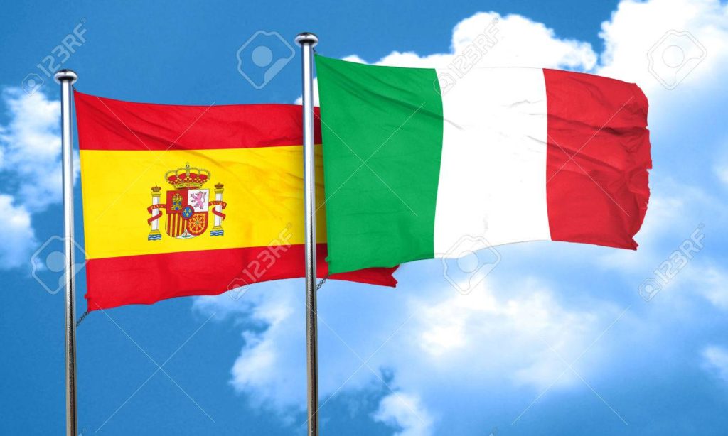Spanish flag with Italy flag, 3D rendering
